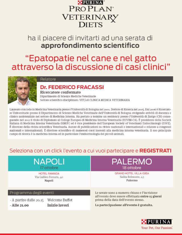 Si terrà il 18 ottobre p.v. presso il Grand Hotel "Villa Igieia" una serata sul tema "Epatopatie nel cane e nel gatto attraverso la discussione di casi clinici". Relatore della serata, organizzata da Purina e patrocinata dall'Ordine, è il dr. Fracassi. La registrazione deve essere effettuata al seguente link. L'evento è gratuito ed aperto a tutti i medici veterinari iscritti all'Ordine.