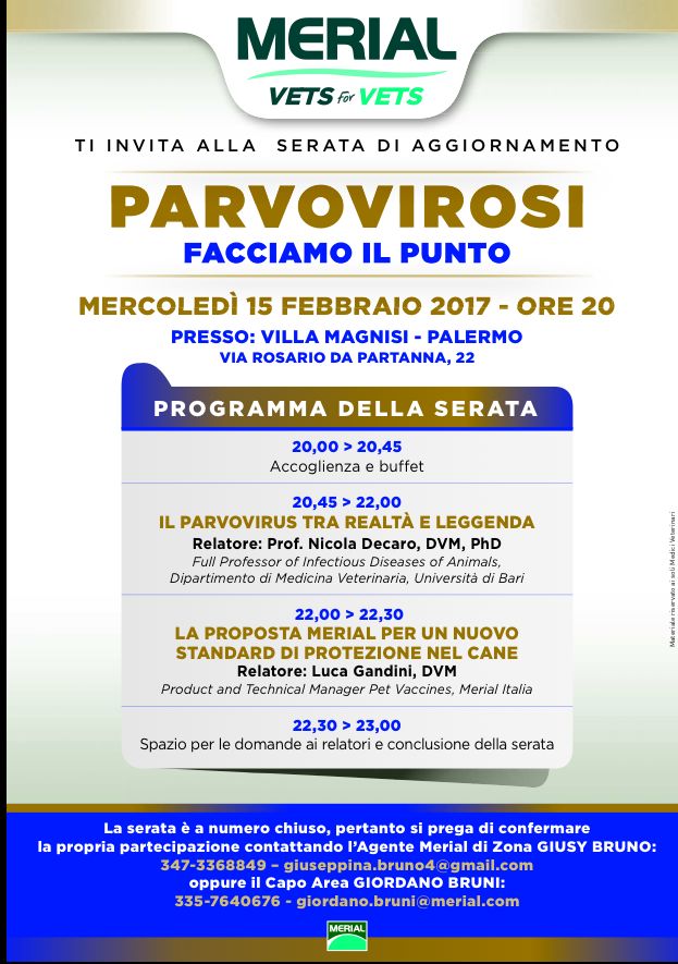 L'Ordine dei Medici Veterinari della prov. di Palermo patrocina un serata di aggiornamento sul tema "Parvovirosi: facciamo il punto". La serata si terrà il 15 febbraio alle ore 20:00 presso la sede di Villa Magnisi in via Padre Rosario da Partanna, 22 Palermo. La serata sponsorizzata dalla Merial, dopo un buffet di accoglienza, affronterà i seguenti argomenti con i dottori Nicola Decaro e Luca Gandini: "Il Parvovirus tra realtà e leggenda" e "La proposta Merial per un nuovo standard di protezione nel cane". Per prenotazione o per semplici informazioni il referente è Giusy Bruno cell. 347-3368849. L'evento è gratuito e aperto a tutti gli iscritti all'Ordine previa prenotazione obbligatoria.